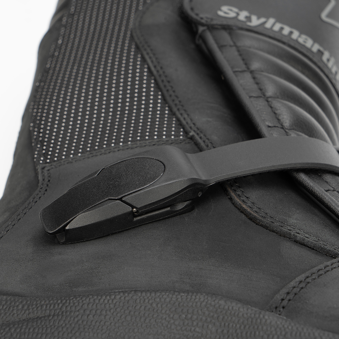 Botte moto avec tige en cuir pleine fleur graissé et tissu haute ténacité, conçue pour assurer sécurité et confort même dans les conditions les plus exigeantes. La doublure imperméable et respirante garde les pieds au sec, tandis que le rembourrage anatomique anti-choc et les protections en PU sur les malléoles, le tibia et le sélecteur garantissent une protection complète. L’articulation frontale ergonomique facilite la flexion, tandis que la fermeture par levier à décrochage rapide réglable et velcro assure stabilité et praticité. La semelle intérieure anatomique anti-choc associée à la semelle en caoutchouc « traction » antidérapante et antihuile garantit adhérence et résistance. Avec ses inserts réfléchissants arrière, Land WP est la botte pensée pour ceux qui exigent fiabilité et protection à chaque trajet.